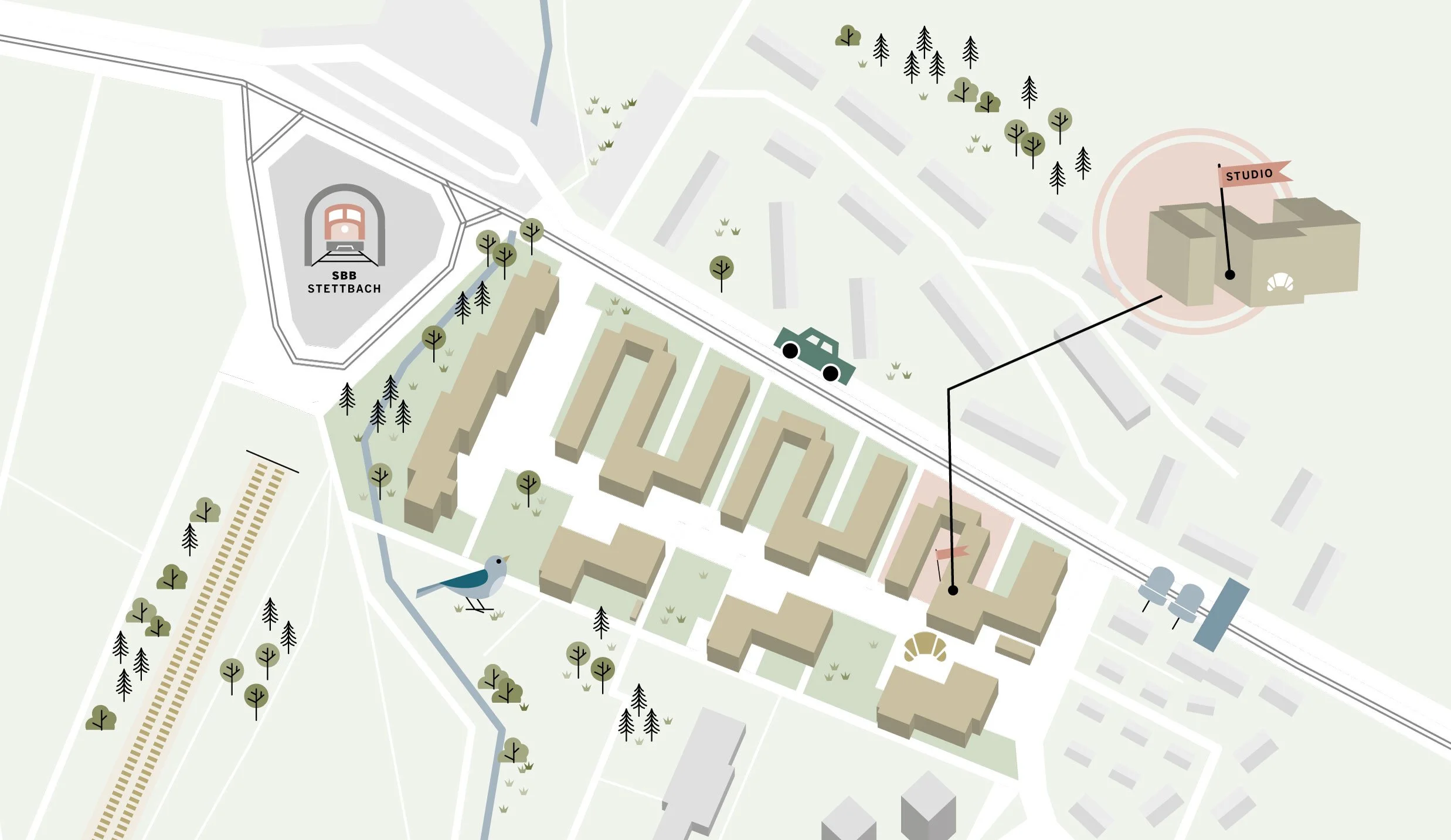 Ich empfehle die Anreise mit den öffentlichen Verkehrsmitteln. Das Studio befindet sich nur wenige Gehminuten vom Bahnhof Stettbach entfernt, der innert sieben Minuten mit der S-Bahn vom Hauptbahnhof Zürich erreichbar ist.